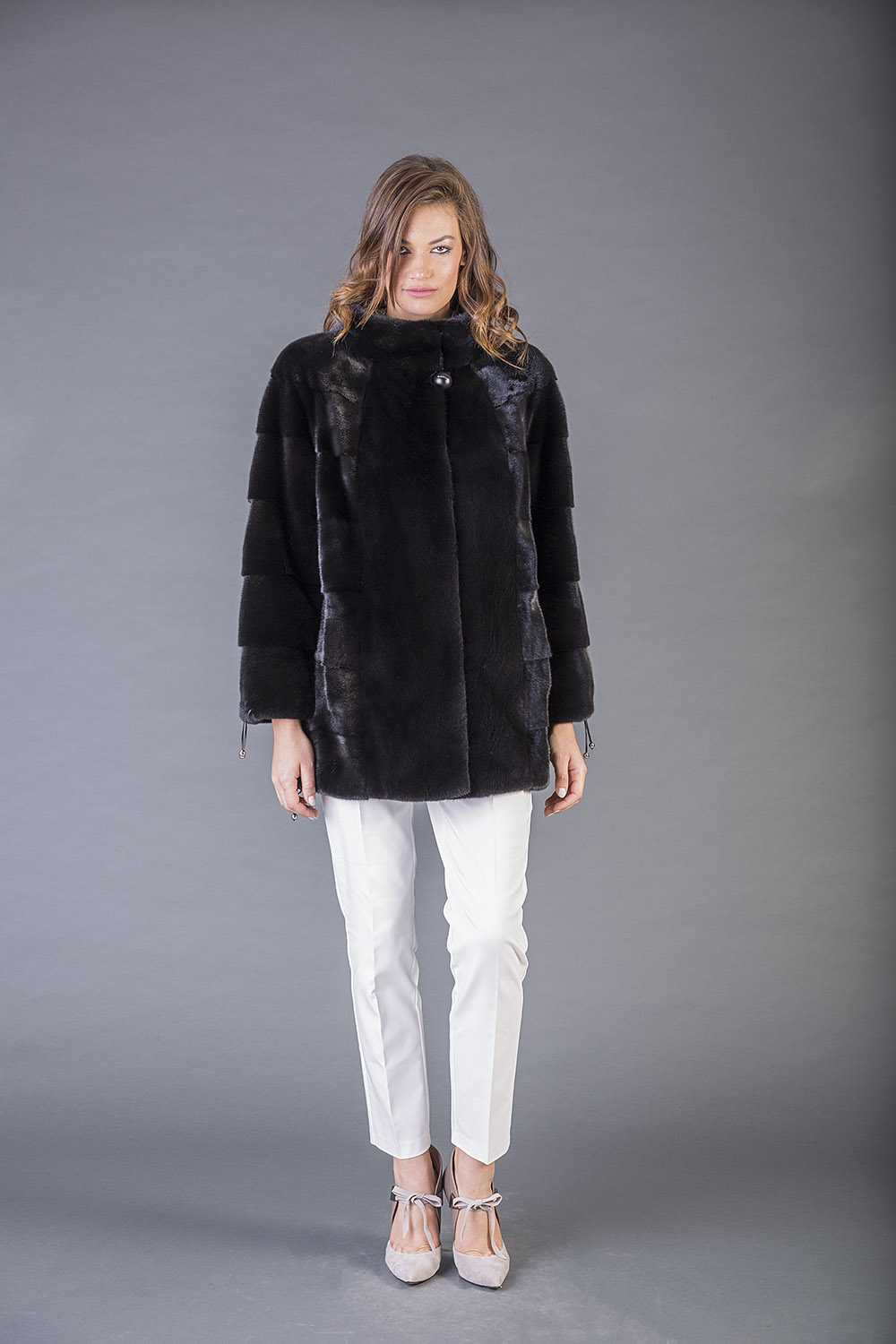 Mink jacket with long sleeves in horizondal striped mink fur BLACKGLAMA, oversized jacket, stand collar, real fur mink coat BLACKGLAMA, Superior quality, Genuine Mink Fur, luxurious quality, Mink Fur is durable, resilient and very soft, made in Greece.