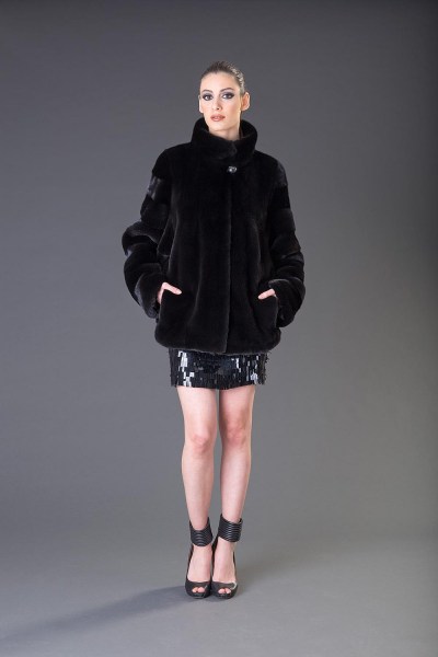 Куртка из меха норки Blackglama, поперечная раскладка шкур "шахматка", передние полочки - роспуск, стойка/отложной воротник, свободный силуэт